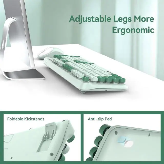 2.4GH z Wireless TechnologyPlug and Play, Free Simply Connection, No need to install any software, no delays or drop the line. 2.4GH z signal delivers up to a range of 33 feet (10m) connection that allows you to work with your PC from a distance. One 2-In-1 USB receiver connects both the keyboard and mouse wireless, high speed rate of return allows the combo to ensure their stable and smooth transmission. (The keyboard or mouse can also be used separately). ^^ Retro Floating Round KeycapsThe typewriter style wireless keyboard with High Profile loud 99 Retro Round keycaps can release your wrist pressure, typing smoothly, gives you the most comfortable typing experience.