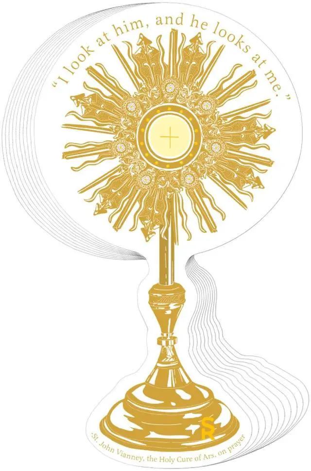 • When St. John Vianney asked a certain peasant of Ars what he did in the church looking at the tabernacle, the humble man responded, "Nothing, I look at Him, and He looks at me." What a simple, beautiful explanation of prayer and contemplation! This sticker featuring a monstrance along with this simple yet profound quote is a wonderful way to be reminded of how we can grow in relationship with God through prayer, Eucharistic adoration, and time together.