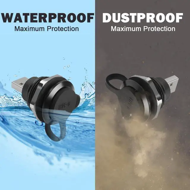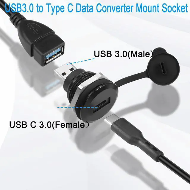 USB 3.0 Male to USB C Female Threaded fixed mount connector. Convert USB 3.0 male to Type C female input and output, providing stable data transmission and charging environment. Equipped with M 241.5 nut, simply cut a 25mm hole on the board surface and fixed mount it through the nut to extend the USB C port. With a waterproof and dustproof cap to prevent rain, dust or foreign objects from entering and protect the inside of the USB C port. Zinc alloy shell, rugged and durable, can meet the needs of home, office or some harsh environments.