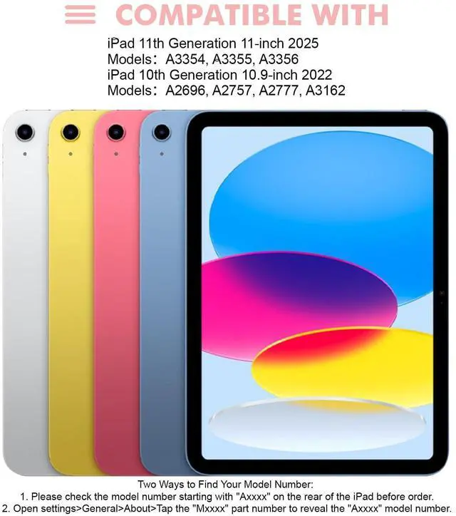 Compatibility: For iPad (A16) 11th generation 11-inch 2025 (Model: A3354/A3355/A3356), For iPad 10th generation 10.9 -inch 2022 (Model: A2696/A2757/A2777). Not for any other models. Please check the model number No. "AXXXX" the bottom of the back of your tablet to confirm correct size before purchasing. ^^ Detachable Keyboard &