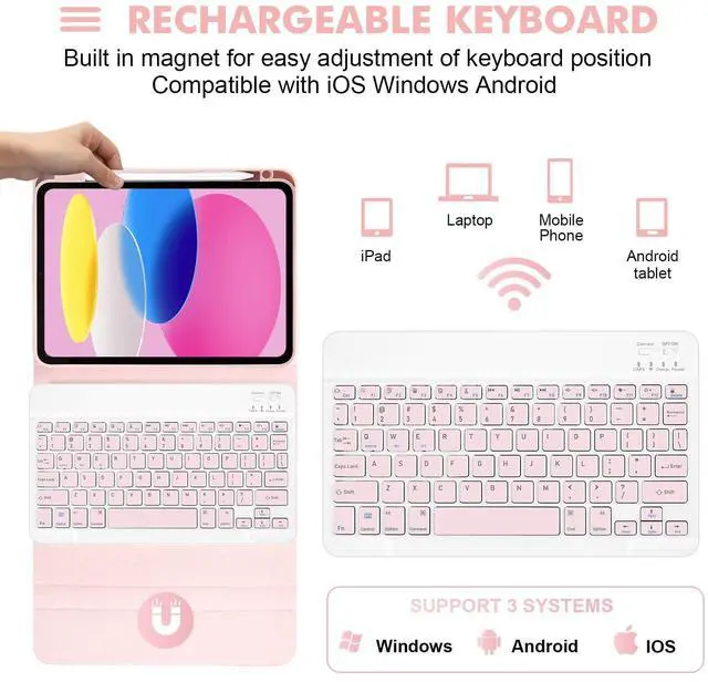 Support 3 Systems: This keyboard is designed with a flip magnet separate design, Removable wireless bluetooth keyboard with magnetic hybrid case that transforms your iPad tablet into an easy to use laptop. Convenient for you to type at home, office, or the outside. You can convert your iPad into laptop through using iPad case and keyboard. And the Bluetooth keyboard supports 3 systems, IOS, Android and Windows.