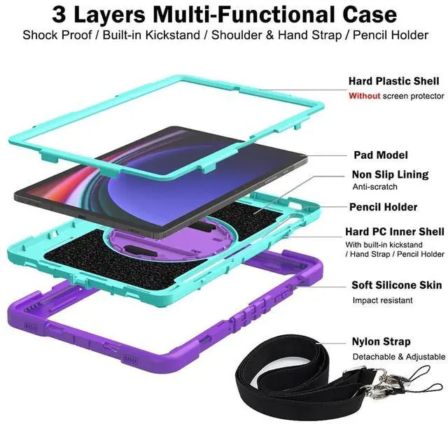 Triple layer defense: Hard PC inner shell, soft shock-absorbing silicone rubber outer cover and touchscreen PC frame protector (No built-in screen protector). * Raised corner and camera protection, reduce the impact of dropping, bumping and scratching from falls accidentally. * Built-in swivel rotating stand for hands free viewing in horizontal or vertical position. * Designed with a pen opening on the back for holding your S Pen, avoid the trouble finding your stylus everywhere. * 360 rotatable hand strap belt design is more fatigue-reducing than the traditional grip, adjustable to accommodate more people and more comfortable. * The shoulder strap is detachable and adjustable in length up to 50 inches. Ideal for adults, teens and kids at home, classroom, office or travel.