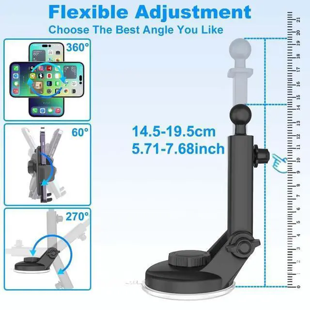 2023 Upgrade Replaceable & Reusable Suction Cup Twist knob can fully squeeze the air and fit the surface perfectly, paired with replaceable repair strong suction cup, create this car dashboard windshield holder mount. You don't have to buy new cradles because of useless pump sucker. 1. The Removable suction cup restores strong suction after washing. 2. Spare Removable suction cup can be used to replace your suction cup or place the suction cup elsewhere. ^^ 270 Rotatable & Long Arm Design This universal tablet car dashboard windshield mount can extending it from 5.71" to 7.68" and Pivoting the telescopic arm up and down 270.