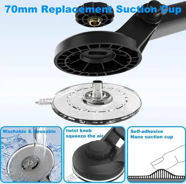 ^^ Multiple Protection 1. Updates Replaceable Suction Cup, Made of pure PU with a new drop gluing process, won't melt under direct sunlight. (-40~194 Weather) 2. The soft silicone surface, it protects your device from scratches or damage. 3. There is a hole in the side of the mount clip to allow the data cable to pass through. 4. The powerful suction cup can be cleaned repeatedly. 5. Spare Removable suction cup can used to replace or place the elsewhere. 6. Please tighten the knob after attaching.