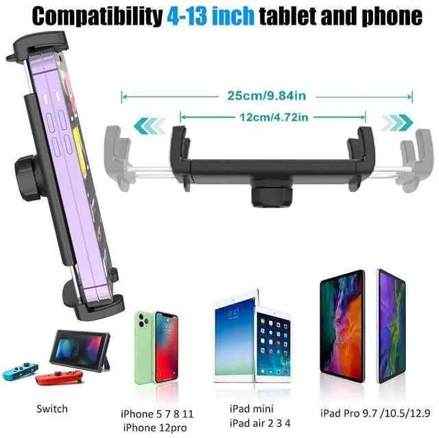 the top ball head can be rotated 360 to provide you with the best viewing angle (horizontal, vertical, up and down), Wont block your upfront driving view and car air vent outlet. Accessible length allows you to easily adjust the ipad car dash window mount. ^^ Universal Tablet & Smartphone Compatibility Car dashboard windshield holder fits all 4-13 inch Device, such as iPad Pro 12.9 11 10.5 9.7, iPad Air 4 3 2 1, iPad Mini 5 4 3 2 1, iPad 9 8 7 6 5 4 3 2 1, Samsung Galaxy Tab, Kindle Fire HD 10 8 7 6, smartphones iPhone 14 / 13 Pro Max / 12 Pro Max / 11 Pro / 11 / X / Xs / XR / Xs Max / 8 / 8 Plus / 7 / 6, Samsung Galaxy S20 S10 + / S10 / S9, Samsung Galaxy Z Fold 4 3 2 1, Samsung M62 M52 M51, Switch and more 4-13 inch cell phones or devices.