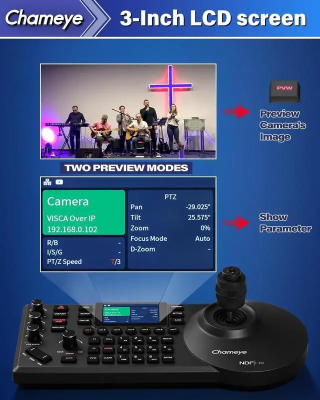 ^^ Multi-Camera Live streamingSupport Up to 255 PTZ Camera control. Connects to your IP streaming PTZ cameras via Ethernet IP, controlling multiple cameras across your LAN with just a network cable. Ideal for multi-camera, multi-angle video production and live streaming. ^^ Multiple CompatibilityChameye PTZ Camera Controller is fully compatible with VISCA, PELCO-P, and PELCO-D protocols. Supports RS232, RS422, RS485, and Ethernet IP connections for versatile control. ^^ Chameye PTZ Bundle is more affordableChameye PTZ Controller Compatible with Chameye PTZ Cameras and video mixer switcher, Compatible with vMix/OBS and other Live Video Streaming Software, Support Multi-cameras video production for live streaming to YouTube and facebook. Compatible with Mac computers, windows PC, etc. ^^ More application scenariosChameye PTZ Camera and PTZ Controller made for Live Streaming, Live Production, online education, academic lectures, virtual classrooms, live streaming of church services, concerts, theater performances, esports events, corporate meetings, court proceedings, medical consultations, museum exhibitions, weddings, outdoor broadcasts.