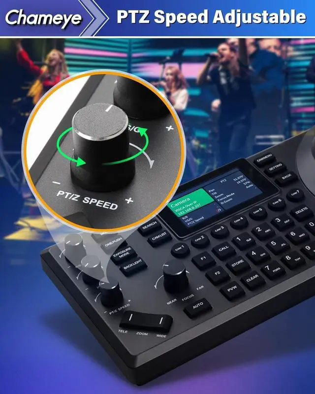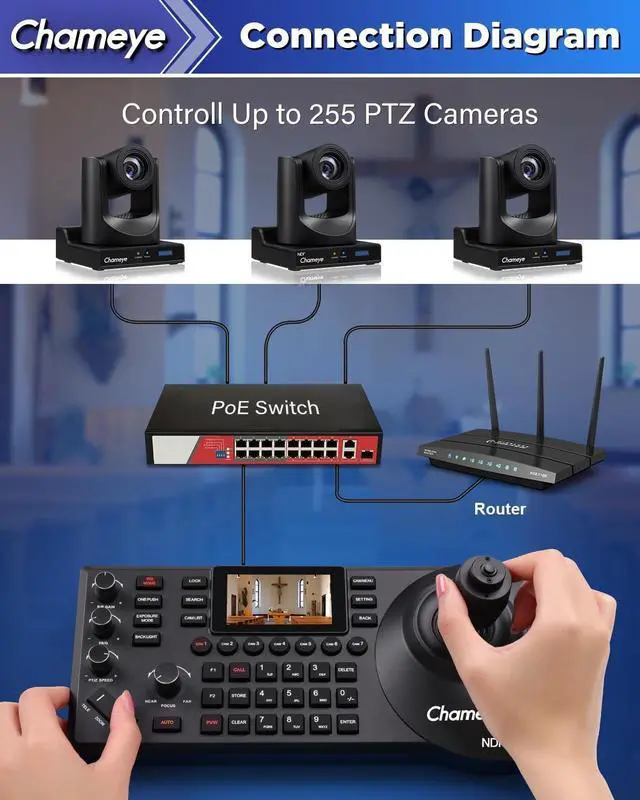 Note: The controller and PTZ camera must be connected to the same LAN, and IP addresses must at the same segment. ^^ Easy to ControlEasy and professional to control PTZ Cameras, automatically searches for camera IP addresses for quick pairing. Pan, Tilt, Zoom, presets, PTZ Speed. Customization F1/F2 keys, programmable settings to turn on or off AI-Auto tracking. ^^ Chameye E300 PTZ ControllerPoE PTZ Camera Controller Keyboard with 3-inch Preview LCD Display, support real-time PVW of current camera viewing. Features a 4D joystick, supports Pan/Tilt/Zoom synchronized control for precise and smooth operation, make you know all cameras controlling better, improve efficiency. ^^ Shop with confidenceEnjoy risk-free shopping. 30-day money-back guaranty for No reason. 3-Year Limited Warranty and Lifetime online support. Our support team guarantees responses within 24 hours and ready to resolve your issues quickly and effectively. ^^ Multifunctional keyboardIP PTZ Controller supports 7 shortcut keys for quick PTZ Camera select & more, up to 1000 cameras information can be saved. With 3D knobs and ergonomic zoom button, camera parameters can be control such as white balance, exposure, focus and zoom, etc.