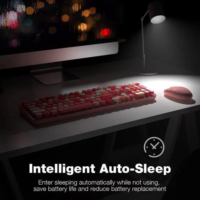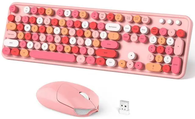 Cute Wireless KeyboardThe inspiration for these cute rounded keys comes from vintage typewriters offering you visual enjoyment and a retro feeling to type. With colorful key caps, make you be distinctive in the office and work full of fun. ^^ Plug and PlayOne USB 2.4GH z nano receiver for keyboard and mouse, does not need any extra software, super easy to use. All you have to do is plug the USB receiver and then give them seconds to install automatically. ^^ Upgrading TechnologyThe keycaps are made of ABS environment-friendly plastic characterized by ergonomic design and a comfortable feel.