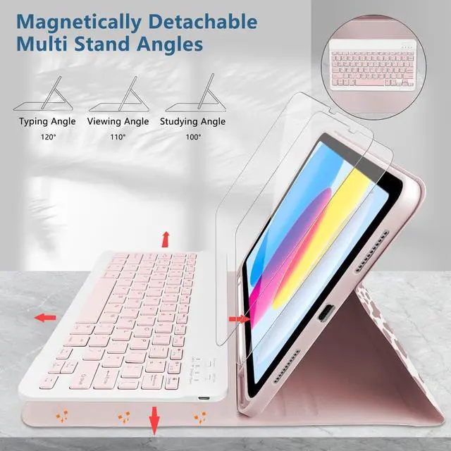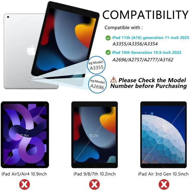 Generation (Model Number: A2696/A2757/A2777). for iPad 11th (A16) generation 11-inch 2025 (ModelA3354, A3355, A3356), Please check the model number on the back of your for iPad before purchasing. ^^ [Pencil Holder and Multi-angle Adjustable Support] This 10th generation for iPad tablet case has a built-in Pencil holder that makes it easy to carry Pencil and take it out. The for iPad case has three grooves that can be used at three angles, and is made of non-slip material that supports the for iPad to stand up. ^^ [Rechargeable Keyboard] The for iPad Bluetooth keyboard has a built-in battery with high stability, so you don't need to replace the battery. You can charge the keyboard using the charging cable that comes with the keyboard. The keyboard has a Bluetooth acceptance range of 10 meters. If you don't need to use the keyboard, you can remove it and turn it into a regular for iPad case, which makes for a handy experience. ^^ [Automatic Sleep/Wake] This for iPad case will automatically put your for iPad to sleep when you close the front cover of the case. Because an iron keyboard may prevent magnets from attracting to each other, remove the keyboard for optimal sleep/wake up.