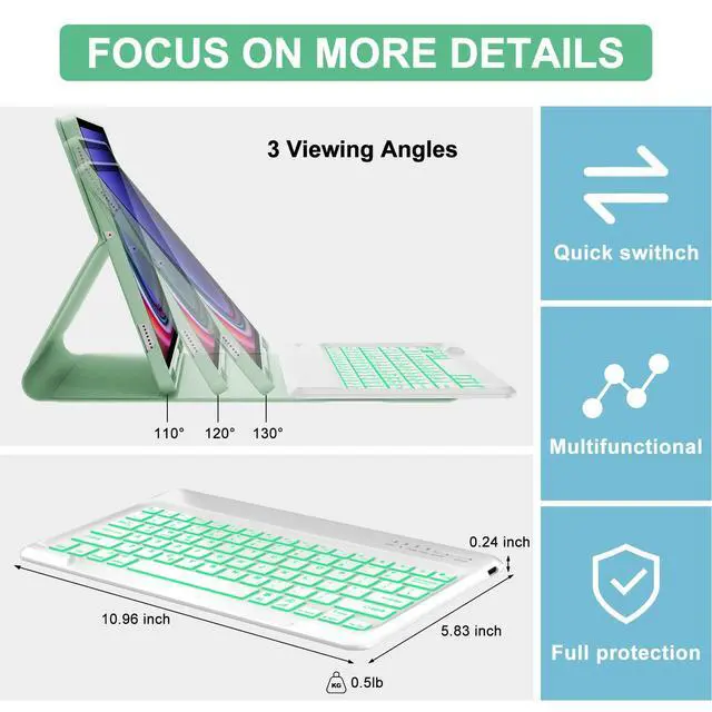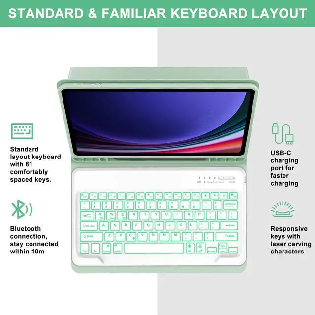 • COMFORTABLE AND SOFT BACKLIT KEYBOARD - Tablet S7 FE keyboard has 7 vibrant solid colors of backlight, 3-level for opening backlit and adjusting brightness level, make typing fun and easy in the dark. Keyboard size (LWH): 10.965.830.24 inch.