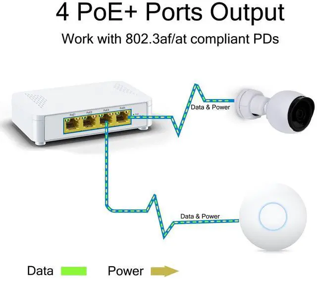 Note: This is a 48V active PoE switch, NOT compatible with Ubiquiti devices which require 24V Passive PoE. ^^ Plug and PlayUnmanaged PoE switch easy setup with no software installation or configuration needed. ^^ Priority ModePoE switch 4 port Support Priority mode for ports 1-2, guarantee high quality of video or voice data transmission. ^^ Fanless DesignThe small PoE switch fanless design makes PoE hub work without any noise. ^^ After-sales ServiceWe provide one-year after-sales service for 5 port poe switch gigabit. Within 1 year from the order, only replacement is not repaired.