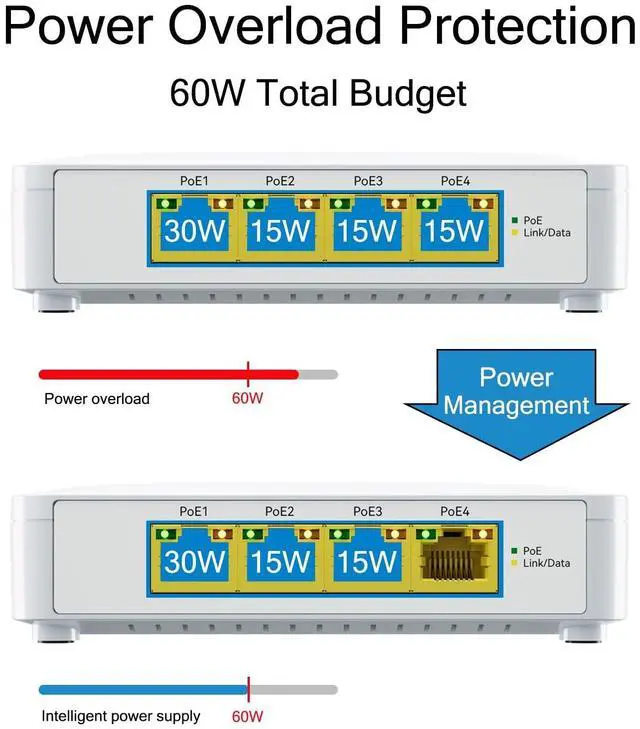 Gigabit PoE SwitchThe 5 port PoE switch has 4 x PoE+ ( 802.3 af/at compliant) 10/100/1000 Mbps RJ45 ports providing up to 30W per port and total PoE power budget of 60W, 1x Gigabit LAN Port for high-speed connections.