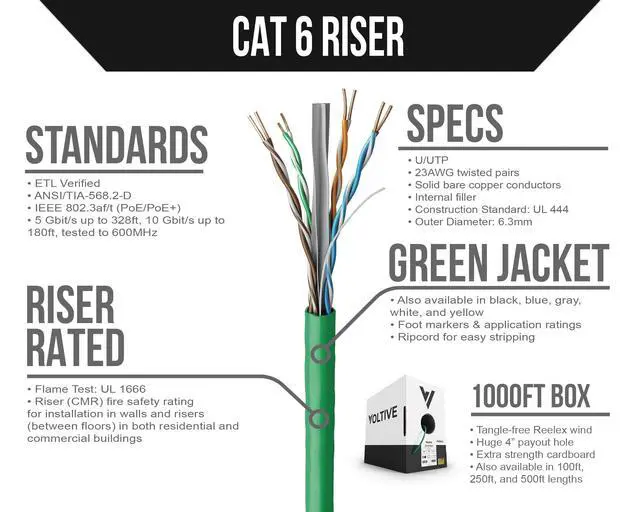 Voltive Cat6 Riser (CMR), 1000ft, Green - Solid Bare Copper Bulk Ethernet Cable - UTP - 600MHz - UL Certified & ETL Verified
