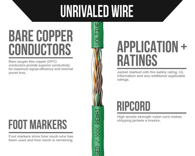 CAT 6 NETWORK CABLE. 23 gauge, 4 pair, solid copper conductors w/ spline, unshielded (UTP). 1, 2.5, and 5 Gigabit speeds up to 328ft, 10 Gigabit up to 180ft. ETL Verified. Tested to 600MHz. PoE, PoE+, & 4PPoE/PoE++. ^^ OXYGEN-FREE COPPER. Oxygen-free copper (OFC) conductors result in less signal loss and are more durable than conductors made of copper-clad aluminum (CCA). ^^ RISER RATED. Riser (CMR) fire safety rating for installation in walls and risers (between floors) in both residential and commercial buildings.