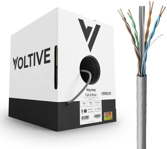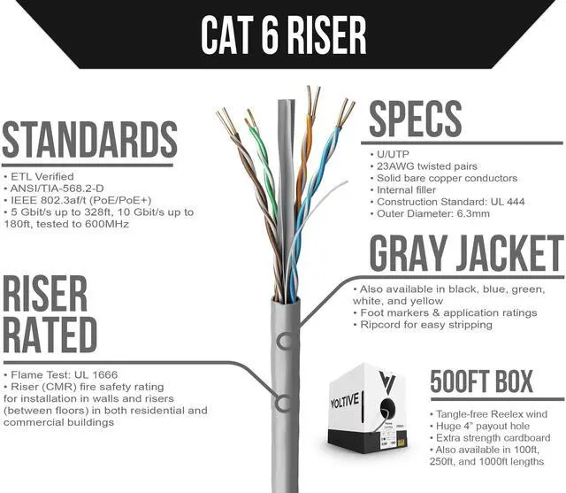 Voltive Cat6 Riser (CMR), 500ft, Gray - Solid Bare Copper Bulk Ethernet Cable - UTP - 600MHz - UL Certified & ETL Verified