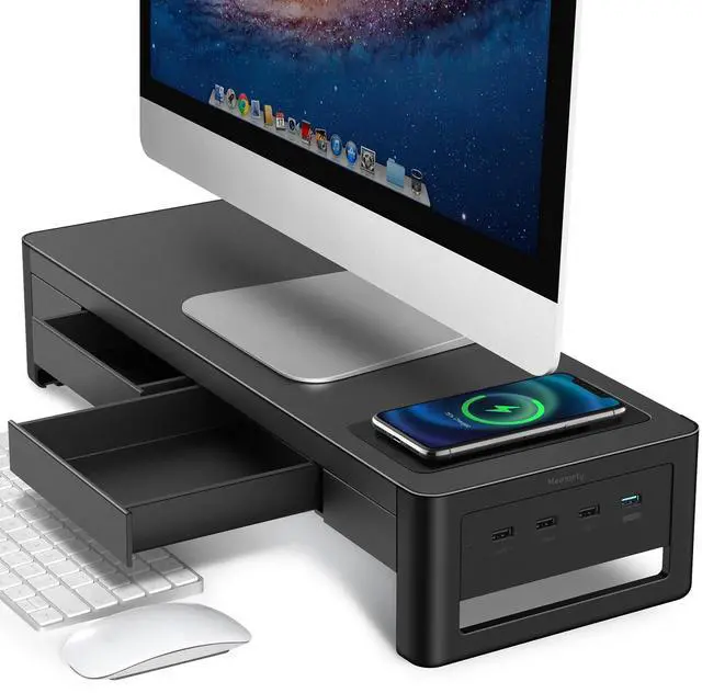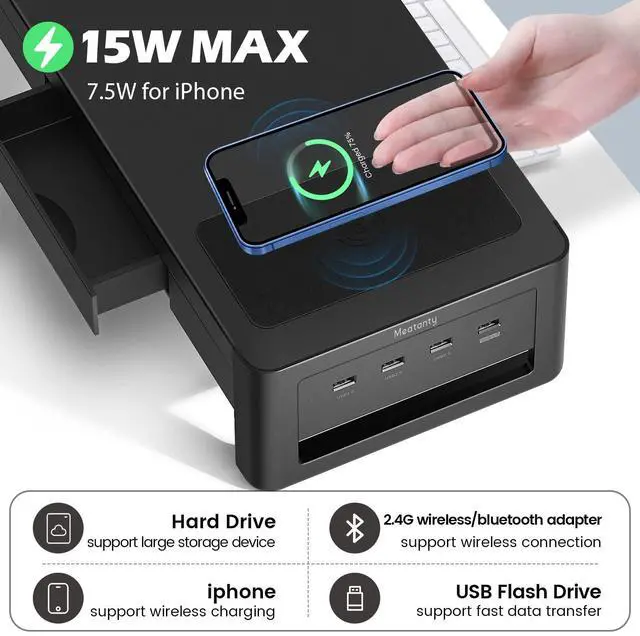 3-In-1 Multi-Functional Design The only monitor stand with drawer, wireless charging and USB extension on the current market, which greatly improves your convenience and comfort in daily life and office. Made of high quality metal material, this monitor stand riser can support items up to 66 pounds and monitors up to 27 inches such as IMAC. ^^ Wireless Charging ModuleWith Max 15W wireless charger, Meatanty monitor stand makes charging more convenient by simply putting your phone on the charging area.