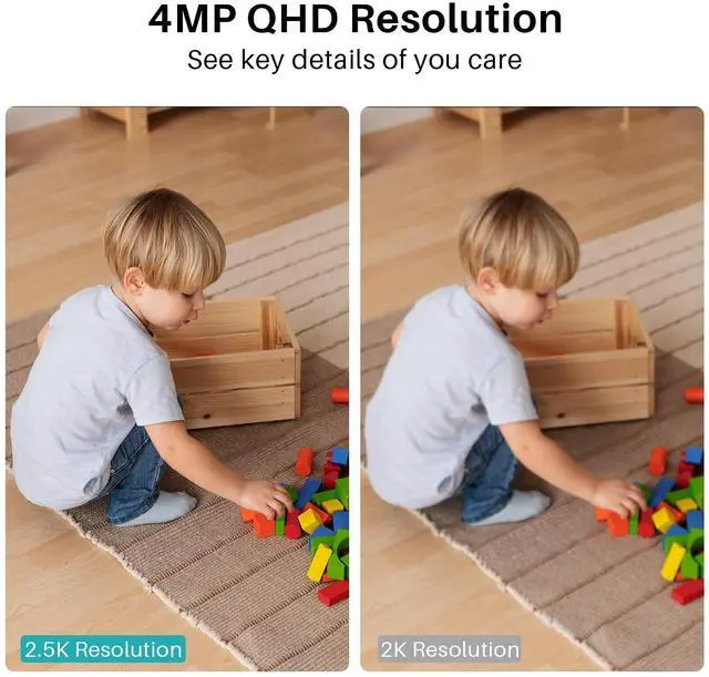 4MP Ultra HD Resolution and Clear Night VisionWUUK indoor security camera has 100% higher resolution than 1080p (2 MP). With built-in infrared night vision, you can monitor accurately at night, allowing you to see every detail clearly. ^^ Motion Detection and Automatic TrackingWUUK WiFi surveillance camera has motion detection and tracking function for people and pets; when motion is detected, the 360-degree security camera will automatically track and follow moving objects; and record moving objects. ^^ 2-Way AudioThe security camera has a built-in speaker and microphone so you can communicate with your children or pets in front of the camera.