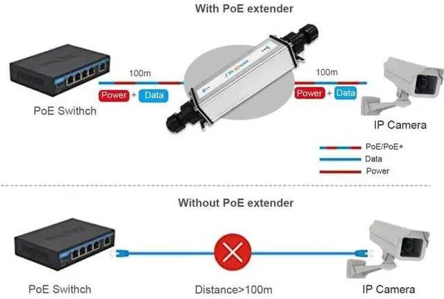 DescriptionEthernet and PoE connections both restrict cable distances to 100 meters betweennetwork ports. To overcome this distance limit, network installers can simplyconnect an PoE Extender in-line with the Cat-5e or Cat-6 calbe. With PoE Extender, PDs (such as IP Security Cameras, VoIP telephones, access points) can be installed at greater distances than 100 meters from oneanother. By connecting PoE Extender for every extra 100 meters of cable, bothEthernet and PoE can be extended to 200 meters, 300 meters, or even greaterdistances, depending on PDs power required and power source.
