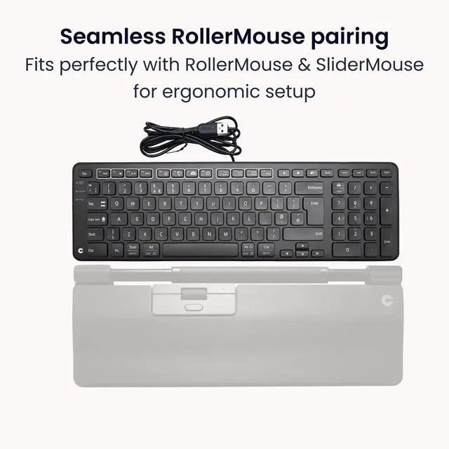 Reducing the distance to the keyboard has a massive ergonomic impact, which is why the Balance Keyboard, with its narrow edge, is the perfect partner for your RollerMouse or SliderMouse. Ergonomic keyboard designed with an adjustable tilt to match your needsThe adjustable legs and tilt functions make it easy to set the keyboard in three different positions: negative, neutral, and positive tilt. When you place the keyboard in a negative tilt, your hands automatically angle to the optimal position for typing. Ultimately, it leaves your fingers much more relaxed while typing. Get more desk space without compromising functionalityAlthough the Balance Keyboard is compact, it has all the features of a full-size keyboard, including a separate numeric keypad, function buttons, and media control. Balance Keyboard is compatible with both PC and Mac.