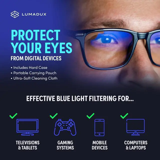 - Relieve Digital Discomfort: Specifically engineered to alleviate symptoms such as migraine headaches and blurry vision, these Lumadux blue light blocking computer glasses are an essential addition to your daily eyewear collection. Why Choose Lumadux? Lumadux Blue Light Blocking Glasses are ideal for anyone who spends significant time in front of screens. Whether youre working, gaming, or reading, our glasses help reduce the risk of digital eye strain and improve overall eye health.