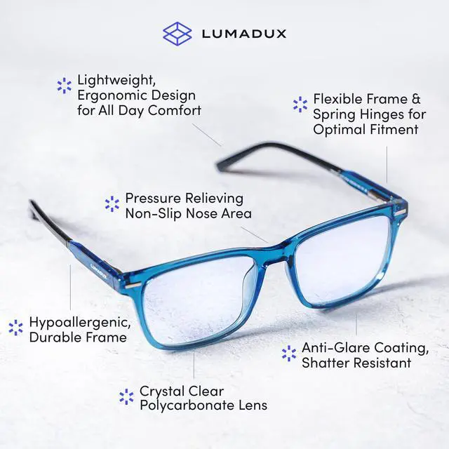 - Enhanced Productivity: Experience less discomfort and fatigue, allowing you to stay focused and productive throughout the day. Perfect for All Ages Lumadux glasses are suitable for both adults and kids. Ensure your whole family enjoys the benefits of blue light protection, whether theyre studying, working, or enjoying their favorite digital content. Experience the Lumadux difference today and invest in your eye health. Protect your eyes, enhance your comfort, and enjoy the digital world without the worry of blue light exposure. Order your Lumadux Blue Light Blocking Computer Glasses now!