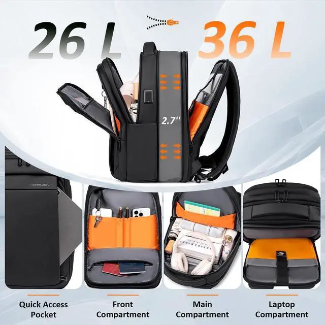 Spacious Capacity: With dimensions of 17.7 x 7.1 - 9.8 x 11.8 inches, this smart backpack offers a flexible 26-36L capacity, ideal for business trips, daily commuting, or travel ^^