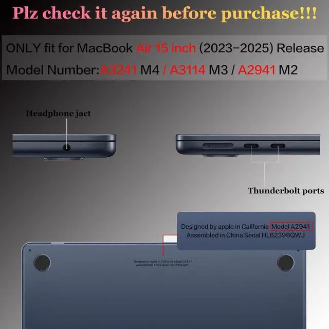 This case is ONLY compatible with MacBook Air 15 inch Model A2941 / A3114 / A3241 M2 M3 M4 Chip with Liquid Retina Display and Touch ID 2023 2024 2025 release.