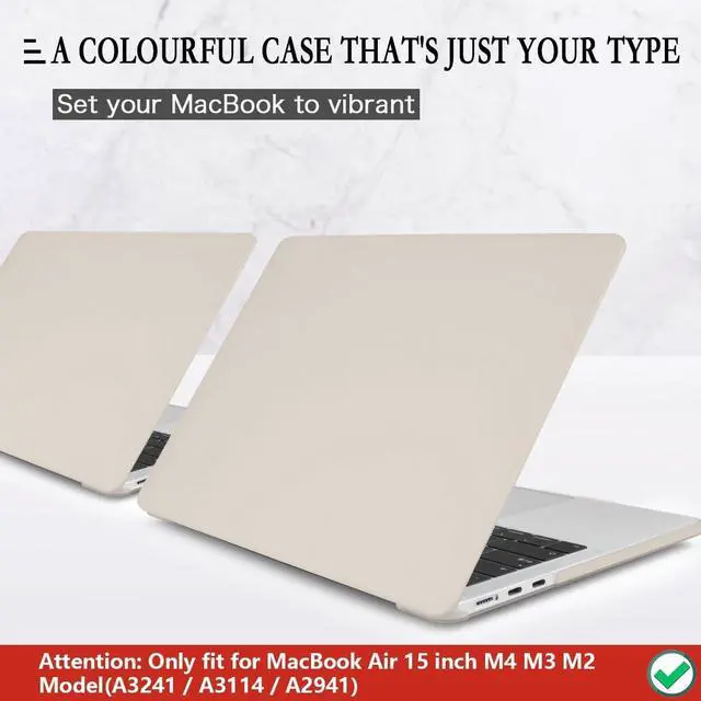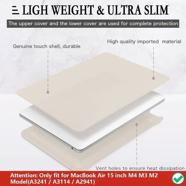 ^^ ATTENTION: Not 11 inch or 13/ 13.6 inch Case. This case is NOT compatible with Macbook Air 13/ 13.3, MacBook Pro 13/Pro14/Pro 15/Pro 16 2010-2022 Release Model. Please kindly Check Your MacBook Model "Axxxx" on the bottom before Purchase. Make sure youre ordering the correct size "A2941" or "A3114" or "A3241" for MacBook Air 15 inch Case. It will NOT fit if you bought the wrong size/item. ^^ [Simple Case, Logo NO See Through Design] Made of premium plastic material, Ultra slim but Sturdy and Durable, Light-weight ( 9.8 oz or 280 g) with soft touch beige texture surface like a glove. No cut out design that makes your midnight/starlight/space gray/silver macbook air 15 out of the ordinary while keep the original design. ^^ [Two Separated Pieces Case, Snap on/Clip On Design] Top Cover and Bottom Cover Two pieces (separated cover) and Snap on design, easy to clip on and take off, let you open/close your MacBook freely all the time. Thunderbolt port access, also access to all ports without removing the case. Bottom cover with vent slots to heat dissipation and 4 raised rubberized feet to keep your laptop firmly on the place.