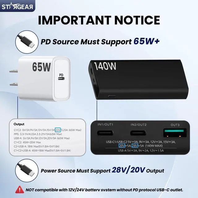 Powerful Protocol Chip: STARGEAR Starlink mini cable intergrated with customized smart protocol chip compatible with 28V PPS and 20V PD protocols, when connected to a compatible PD Type-C power supply capable of providing 28V or 20V, this Starlink cable ensuring a 28V or 20V high voltage output on the DC barrel jack. NOTlCE! NOT compatible with 12V/24V batterv svstem without PD protocol USB-C outlet ^^ 140W Maximum