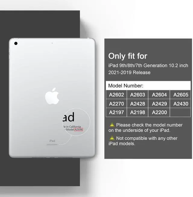 Specifically engineered for 10.2 -inch 2021 iPad 9th Generation (A2602/A2603/A2604/A2605), 2020 8th Generation (A2270/A2428/A2429/A2430), and 2019 7th Generation (A2197/A2200/A2198). Not compatible with other iPad models ^^ Magnetic protective cover automatically wakes iPad 10.2 when open and hibernates when closed to conserve power. Tri-fold stand provides the perfect viewing and typing angle ^^ The translucent frosted back cover lets you see the Apple icon in your favorite color, while the front cover combines a premium PU exterior, microfiber lining, and soft TPU for excellent scratch, impact, and drop protection to ensure long-lasting protection for the 10.2 -inch iPad ^^ Precise cutouts for all ports and buttons make it easy to access all the features of 10.2 iPad without having to remove the case too often.