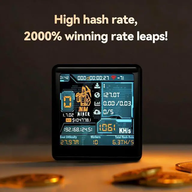 KH/s Hashrate: The NM-TV 154 is an official NMMiner SmallTV featuring a 1.54 -inch smart display and ESP32-D0 chip, delivering a 1060 KH/s hashrate20x faster than standard Nerdminers (55 KH/s). Its optimized firmware boosts BTC lottery winning odds by 2000%, making it the top ESP32 solo miner for crypto enthusiasts. No external computer is needed; just plug in, configure via WiFi/BLE, and start mining Bitcoin (BTC) effortlessly. Perfect for USB Bitcoin miners, crypto miners, and lottery miner fans! ^^ Multi-Functional Smart Desktop Clock & Gift Idea: More than a crypto miner, this device doubles as a sleek desktop clock with a touch-button switch to toggle between mining and time display. The low-power 5V operation ensures 24/7 functionality, while the 240x240 pixel screen shows real-time stats. Compact (45x35x40mm) and stylish, its an ideal smart gift for tech lovers, Bitcoin collectors, or Nerdminer users. Great for offices, bedrooms, or as a conversation-starting gadget! ^^ Plug-and-Play Setup with