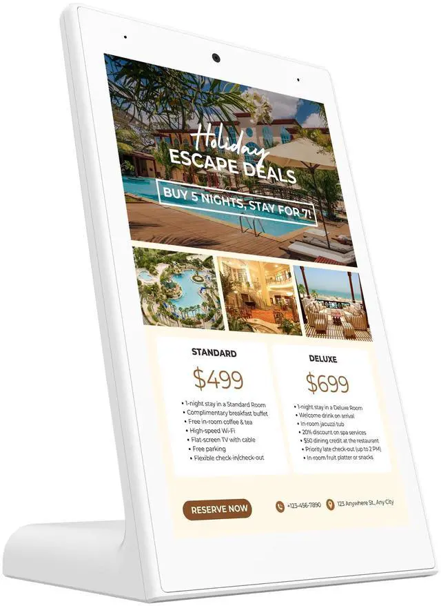 10" HD Touchscreen for Digital Signage Perfect for countertop displays, menus, promotions, and announcements in high-traffic areas. ^^ Pre-Installed with OptiSigns Software Easily create and manage interactive content remotely; access 5, 000+ templates for professional-looking displays. ^^ Optional Background Music Playback Enhance your space with fully licensed, high-quality audio using the built-in OptiSound feature. ^^ Commercial-Grade Performance 4GB RAM, 32GB storage, Wi-Fi, Ethernet & Bluetooth; designed for continuous, plug-in operation with no internal battery. ^^ Compact, Sleek Design Fits seamlessly into restaurants, retail counters, reception areas, and other business environments.