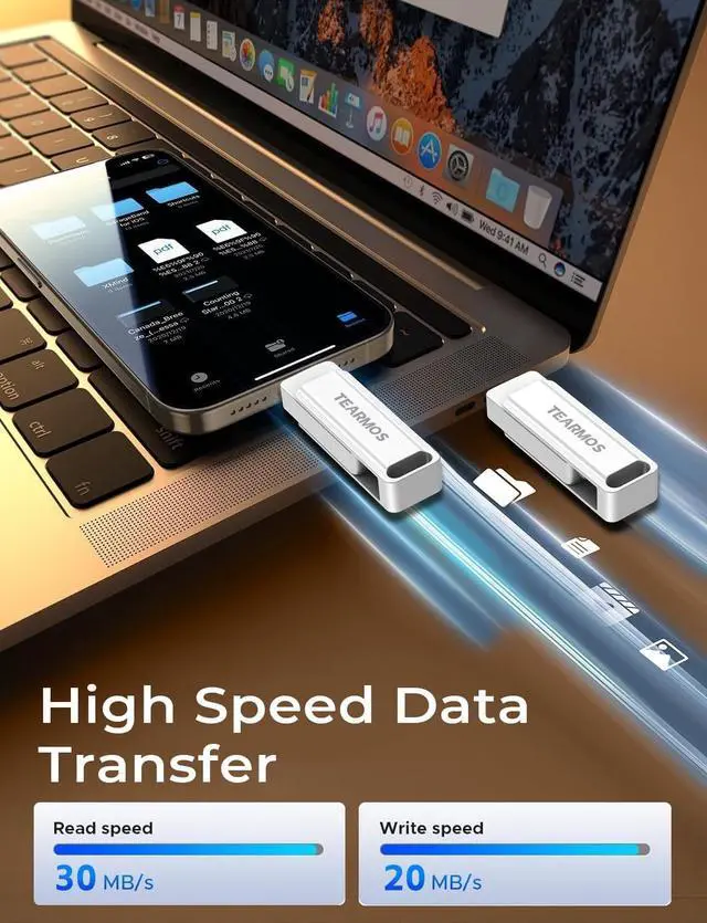 (Note: Requires iOS 13 or higher for iPhone; Android devices must support OTG) ^^ Blazing Fast Transfer SpeedsTransfer photos, videos, and files in a flash! With read speeds up to 30 MB/s and write speeds up to 15 MB/s, our USB stick outperforms standard drives. Edit on the go without buffering or lag, and enjoy a smoother workflow. Lets you effortlessly backup and organize photos, and videos from your phone straight to the phone storage photo stick, freeing up valuable device space.