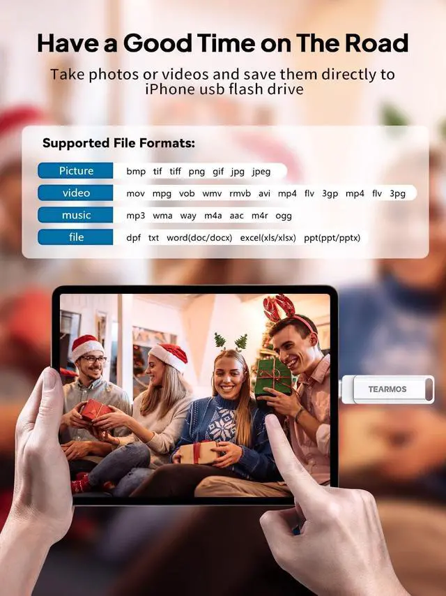 (Note: Just plug in and access via the "Files" app, no third-party software required. ) ^^ Play Videos, Photos, and Music DirectlyStore your favorite media on the flash drive and enjoy seamless playback on your iPhone or iPad, anytime, anywhere, no internet connection needed. It supports a wide range of video and image formats, making it the perfect solution for organizing your digital library. ^^ How to Transfer in iPhone iPadRequires iOS 13 and