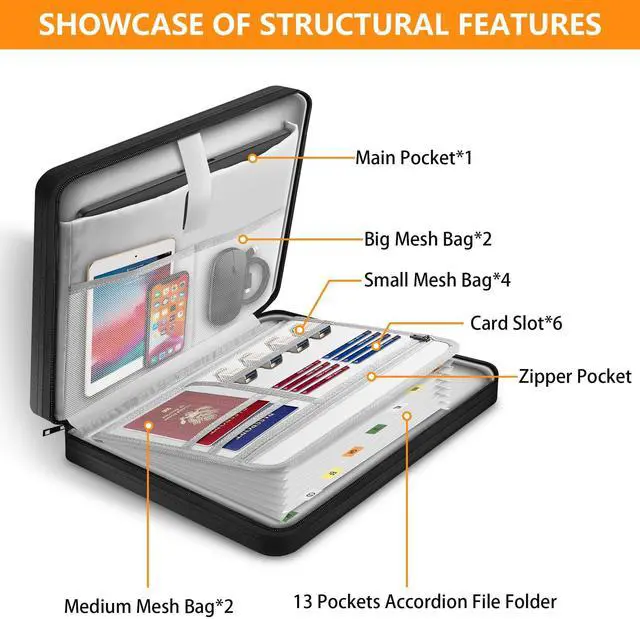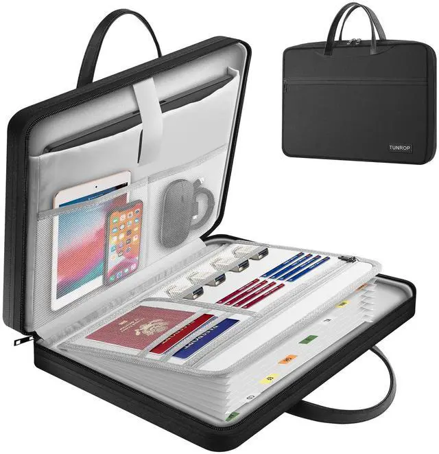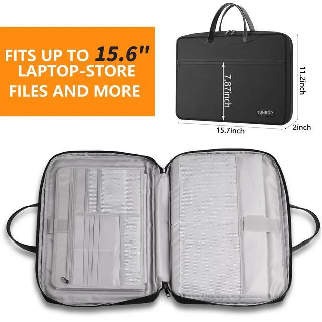 Comprehensive Storage Solution: Our Laptop bag features 1 main laptop pocket, 2 medium mesh bags, 13-pocket accordion file, 1 zipper pocket, 6 card slots, 4 small mesh bags and 1 exterior zippered pocket neatly arranged in a tidy 15.7" x 11.2" x2". With plenty of room, you can effortlessly organize and access all your laptop, important documents and items in one place ^^ Compatibility and