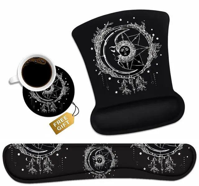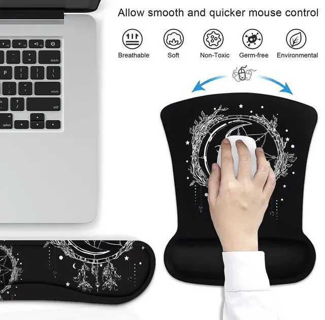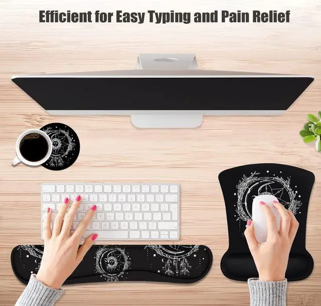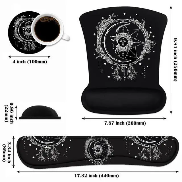 Ergonomic mouse pad with wrist support + keyboard wrist rests + cup coaster set for Home/Office/Work/Study Are you looking for wrist rest mouse pad set with vivid images in bright color? Do you want to get a PC accessory to prevent carpal tunnel issues? If Yes, we just solve your problems NOW, Gaming mouse pad with wrist support set is the right choice for you. Why You Choose Us Wrist pad arc design fits the human wrist joints to keep the wrist in a natural and comfortable state. Keyboard wrist & Mouse Wrist is made of cushioned neoprene, Non-toxic, no odor, harmless to health.