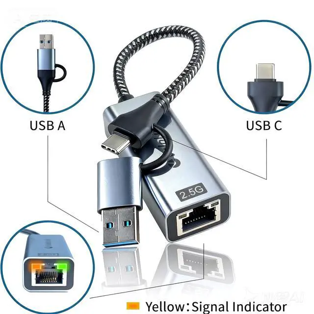 [USB to Ethernet Adapter] Ethernet USB adapter with Gigabit Port- 2.5G bps Data Transfer, The Gigabit USB Ethernet Adapter delivers stable data transfer speeds up to 2.5G bps, and backward compatible with 1000/100/10 Mbps networks. supports uninterrupted large downloads at maximum speed. ^^ [Dual-Port Ethernet Adapter] Ethernet to USB Adapter converts a USB-C port to a USB-A port. Its dual-port design ensures you have the right interface to connect to your devices. (Requires a USB 3.0 port for optimal performance) ^^ [Plug to Play] USB Ethernet Adapter Enjoy high-speed networking up to 2.5G bps without installing drivers.