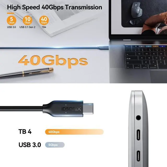 Mode) (Note: Only Macbook Pro with 4 usb c ports can achieve dual 4k output by 2 USB4 cables). ^^ Full Charge in Minutes iDsonix USB4 cable with 100W (20V/5A) supports PD 3.0 /QC 3.0 power delivery, support up to 100W charging. Designed for laptop charging with USB C port, greatly solve the problem of slow charging when your Macbook is thirsty for power.