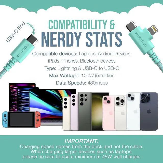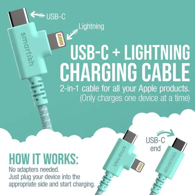 Charge All Your Devices: Ditch the tangled mess of cables! This 2-in-1 charger features both a Lightning connector and a USB-C connector, allowing you to seamlessly charge your iPhone, iPad, Android phone, and other USB-C devices with a single cable.