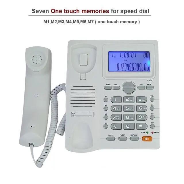 Easy to install: Can be placed on the desktop and wall. 3. Maximum 50 groups for incoming call record.. 4. Maximum 14 groups of outgoing call record. 5. Real date, week, and caller ID display. 6. Blue backlight for LCD. 7. 5 levels of LCD brightness adjustable 8. Flash time adjustable. 9 Area code and PABX code setting. 10. P/T dialing mode adjustable. 11. Redial Pause Flash and hold function. 12.7 groups of one touch memories 13.10 groups of two touch memories 14.3 grades of handset volume adjustable 15.3 grades of speaker volume adjustable 16. Incoming call LED indicator 17. In use led indicator