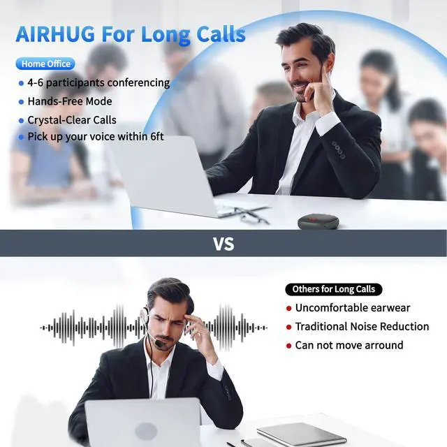 On the other hand, AIRHUG 01 supports that bluetooth and usb-c cable are connected on your computer at the same time ^^ Absolute 360 Full Range Sound - AIRHUG 01 equipped with an upgraded full-duplex digital microphone which can pickup voice within 6 ft and suitable for 4-6 people conference meetings. The 48, 000 samples/sec sampling rate makes sure the AIRHUG 01 speakerphone has DVD standard sound quality and never misses any one word. The bluetooth speaker with microphone's sound is always high-fidelity while playing music or online conference audio. The sound is more real and stereo than you imagined ^^ Exclusive Highly Efficient & Integrated DSP Processor - Built in high performance DSP chip and exclusive echo cancelling algorithm provide high-speed, real-time, intelligent processing for audio.