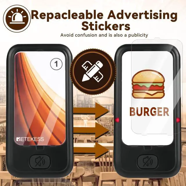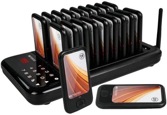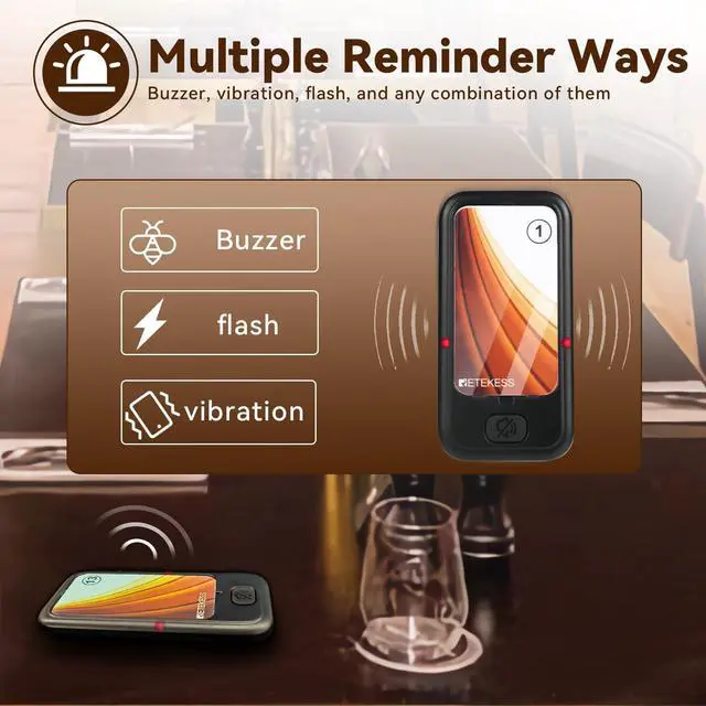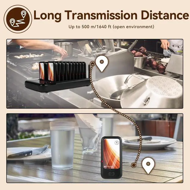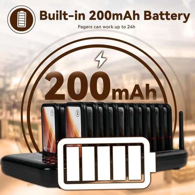 One touch mute; some customers may prefer silent alerts, especially those who are sensitive to sound; and the mute function of the food pager system can provide a more comfortable experience ^^ Multiple prompt modes; pagers for church no sound; the keyboard transmitter can be set to silent/buzzer/vibration mode; buzzers for restaurant can vibrate/ beep/ light; prompt mode can be combined according to need ^^ Using ASK technology; equipped with external antenna; restaurant paging system working distance is about 300-500m in open area; reliable working distance help you take care of each customer ^^ Master your coaster battery status; each restaurant pager system has a built-in 200mAh battery; can standby for about 24 hours; charging indicator is always on when fully charged ^^ Support viewing call records; order ready buzzer for food truck can display the 10 call records; press up or down key to check; helps to remind unnoticed customers again