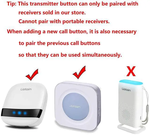 Color: 2 Portable/Fixed Call Buttons Wireless nurse call button transmitter for patients, the disable, the elderly or pregnant, receiver is not included, they can press the button to get timely care when they need help. When you receive the button, you need to pair the button to the receiver then the button can work well with the receiver.