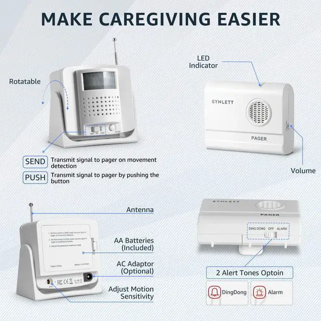 SYNLETT CAREGIVER PAGER KIT with TWO WIRELESS CALL BUTTONS & MOTION SENSOR This simple, caregiver call button and motion alarm pager system comes with two Call Buttons one motion sensor and a Wireless Caregiver Pager. It has an alert chime and the pager is small enough to be carried in the pocket or clipped to a belt. Emergency call buttons can alert caregiver to respond to residents when in need of assistance. Motion sensor is capable to signal the pager when detecting movement in the detection range. Allow both caregiver and resident freedom while calling for help at the touch of an alarm call button.
