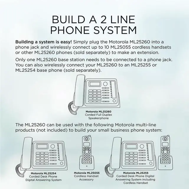 Building a system is easy! Simply plug the Motorola ML25260 into a phone jack and wirelessly connect up to 10 ML25055 cordless handsets or other ML25260 phones (sold separately) to make an extension. Only one ML25260 base station needs to be connected to a phone jack. You can also wirelessly connect your ML25260 to an ML25255 or ML25254 base phone.