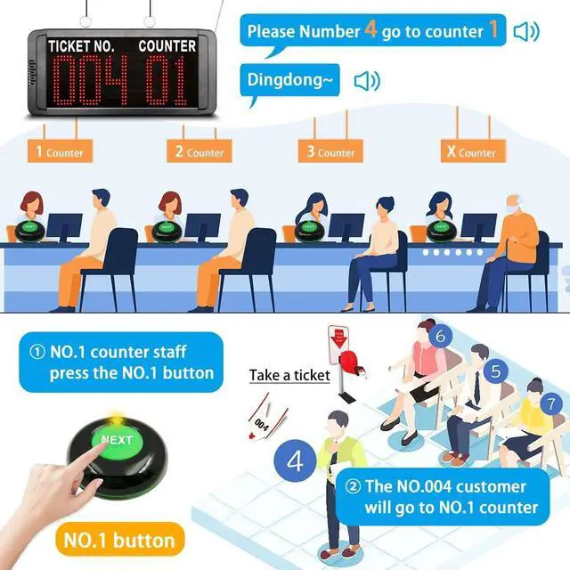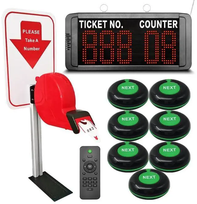 KOQICALL Take a Number Machine 3-Digit Queue System for Customers with 1 LED Display Broadcast Ticket and Counter Number 7 Waterproof Next Call Button 1 Red Ticket Dispenser Stand