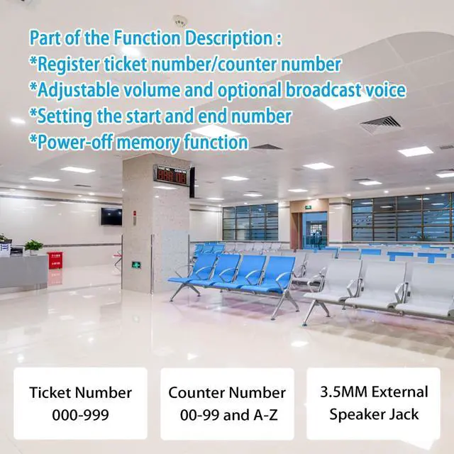 Freely Set Start and End Numbers: This queue system can store up to 999 numbers, and by default, the numbers are displayed sequentially from 001 to 999. You can limit the call range on the display, for example, setting it to 50-100. This feature enhances the flexibility of the wireless queuing system.