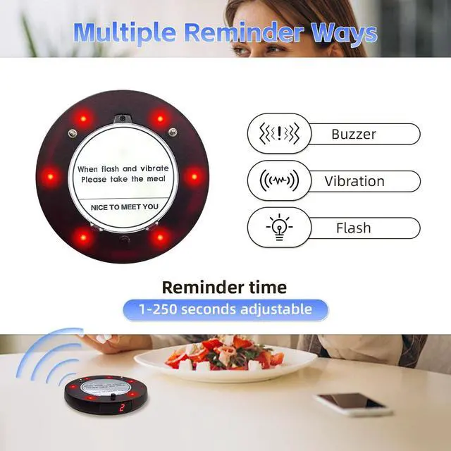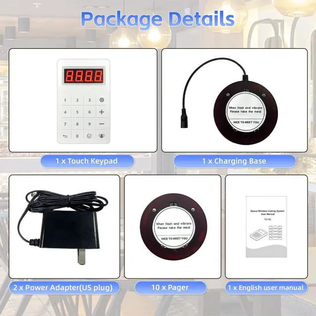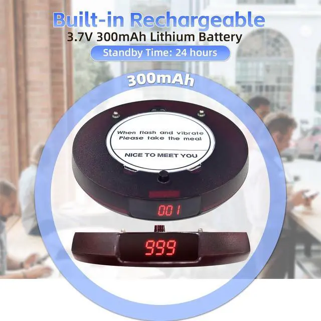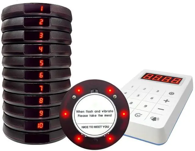 LONG RANGE This pager system comes with 10 coaster buzzers, supports up to 999 pagers. The transmission range of restaurant pagers can reach as far as 1, 300 feet in open spaces. ^^ 3 NOTIFICATION MODES The restaurant pagers use vibration, light, and sound alerts to ensure they're noticeable even in noisy environments. ^^ VERSATILE & PRACTICAL Perfect for restaurants, cafes, food trucks, clinics, churches, and more. Simplifies order management and improves customer flow. ^^ EASY TO USE These restaurant buzzers feature true plug-and-play operationsimply type the number to call, and the pager instantly responds.