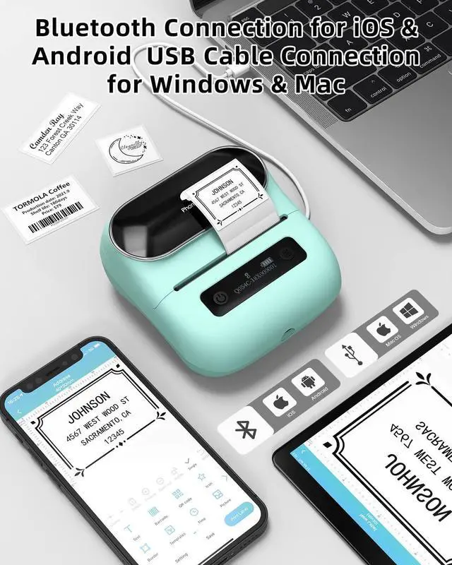 Wireless & Inkless Label Printer - Equip with Bluetooth 4.2, this thermal label printer can easily connect with the smartphone via Bluetooth function. Direct thermal printing technology, get rid of any ink and ribbon, Convenient and clean. Android and ios mobile phonetablet by bluetooth connection, but also supports USB connection for MAC and Windows 7, 8, 10, 11.