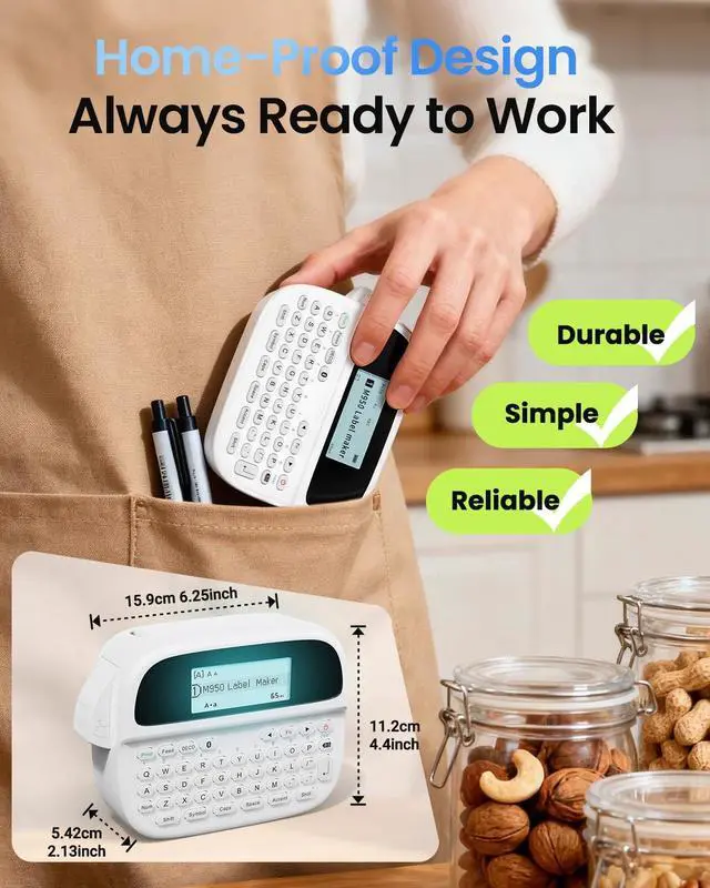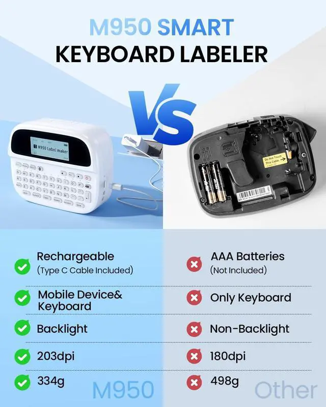 Rechargeable Label Maker : No more wasting money on disposable batteries! EazeID M950 label maker machine with tape comes with a built-in 1200mAh rechargeable lithium battery, that can be used repeatedly. We even include a roll of label tape and a USB C cable in the package. Simply plug it into a 5V-2A charging adapter to start using it